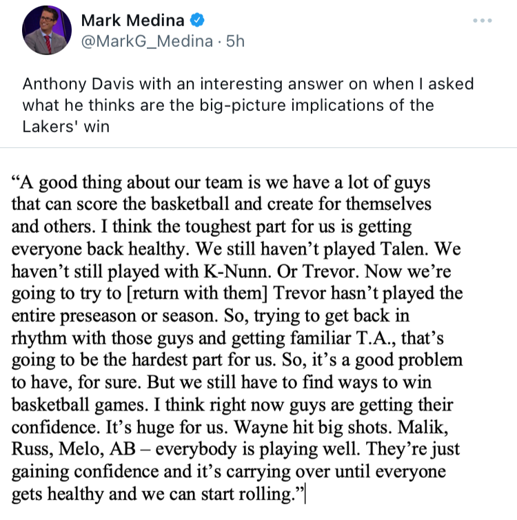 우리팀의 좋은 점은 점수를 낼 수 있는 선수들이 많다는 것. 우리가 극복해야 될 어려움은 모두가 건강해져야 한다는 것. tht, 넌, 아리자랑 뛰지 못 하고 있고 아리자는 프리시즌부터 지금까지 뛰지 못 했다. 그래서 그들이 돌아왔을 때 리듬을 회복하는 것과 합을 맞추는 게 제일 어려운 부분이 될 것. 어쨌든 계속 이기기 위한 길을 찾고 있다. 지금 뛰는 선수들은 자신감을 얻는 중이고 그건 의미가 크다.