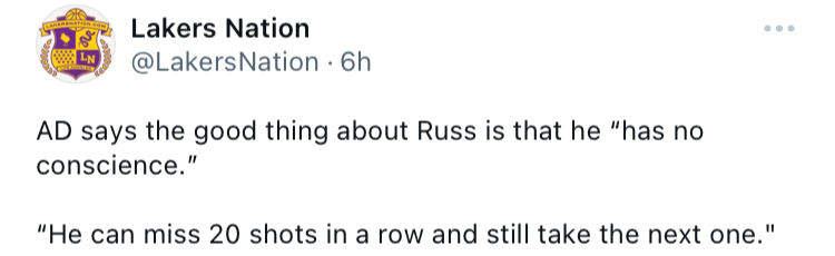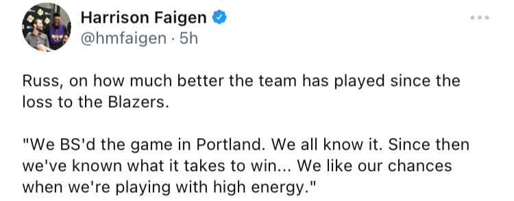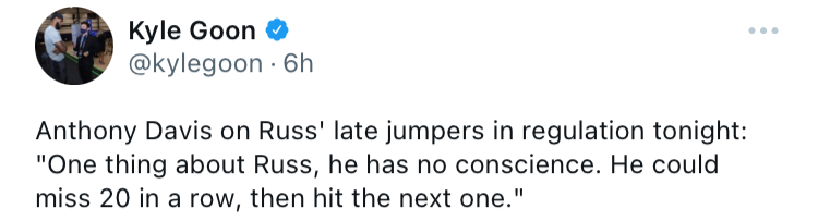 - 러스랑 우리가 어떤 모습이길 바라는지.. 어떻게 움직여줬음 좋겠는지에 대한 얘기를 했어. 그의 턴오버를 줄이는 일에 우리가 도움을 줄 수 있도록 말이야. 우린 대화를 나눴고, 그 결과가 오늘밤 나타난 거지.(긍정적인 뉘앙스) -박스스코어 용지를 힐끗 본 뒤- 그렇게 말했지만 턴오버 8개 했네... 그치만 적어도, 트리플 더블 했잖아. 콰드루플 더블이 아니라.